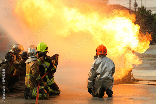 Firefighters using Twirl water fog type fire extinguisher to fighting with the fire flame from oil to control fire not to spreading out. Firefighter and industrial safety concept.