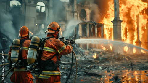 firefighter, safety, danger, pumping, water, extinguish, ruin, emergency, rescue, bravery, heroism, flames, protection, gear, hose, teamwork, effort, intensity, destruction, smoke, heat, courageous, response, action, crisis, hero, inferno, firefighting, structure, crumbled, chaos, catastrophy, hazardous, uniform, equipment, courage