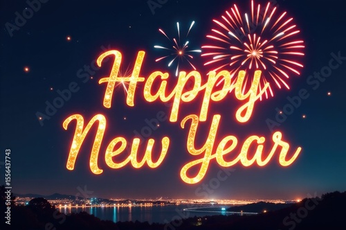 Fireworks display with 'Happy New Year' written on them, suitable for celebrations and greetings..New Year 2026.