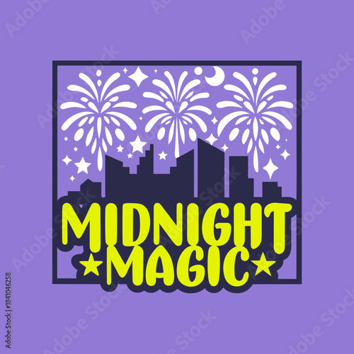 Fireworks over city skyline with midnight magic text
