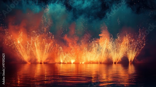 fireworks, water, night, sky, sparkle, celebration, show, display, event, festival, holiday, pyrotechnic, light, colours, bright, dark, dramatic, beautiful, high-coloured, burst, glowing, gold, orange, red, blue, green, smoke, steam, lake, duck pond, river, surface, still, calm, silhouette, nature, photo, landscape, art, image