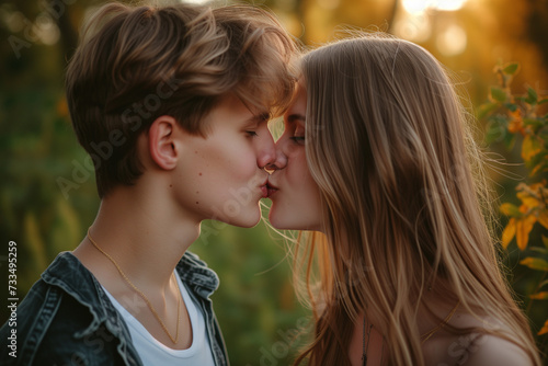 First Kiss of a Teenage Couple, Surrounded by Nature in Their First Kiss Full of Affection and Love on Kiss Day