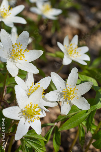 First spring white flowers anemones in the forest