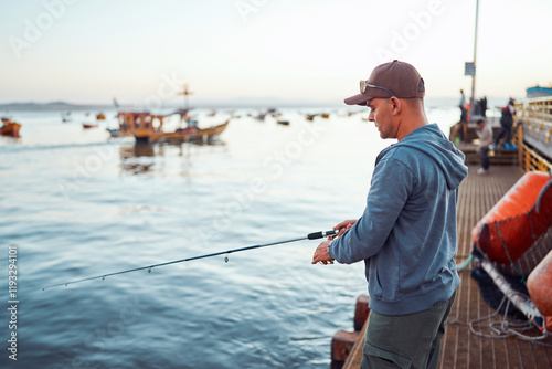Fisherman holding fishing rod on a pier, concentrating on fishing with boats in the background