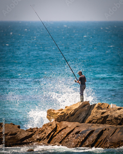 fishing, sea, beach, water, ocean, rod, fish, fisherman, angling, leisure, sport, blue, coast, boat, hobby, sky, pole, wave, recreation, reel, sunset, line, vacation, sand, surf, morocco