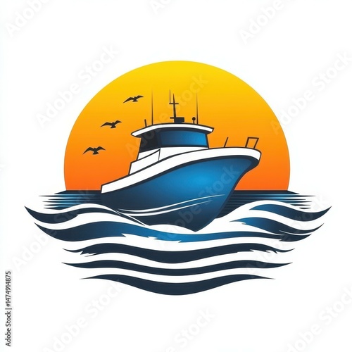 Fishing boat navigates calm waters during sunset with birds flying overhead