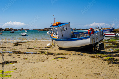 Fishing boat on a beach in Brittany. Sandy beach strewn with seaweed.