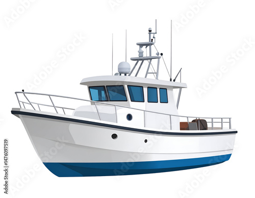 boat, vessel, fishing, nautical, ship, maritime, watercraft, commercial, ocean, sea, transportation, navigation, deck, cabin, equipment, engine, modern, white, blue, profile, illustration, graphic, design, vector, isolated, fishing boat, technology, industrial, power, seafood, commercial fishing, marin, transport, safety, professional, water, voyage, exploration
