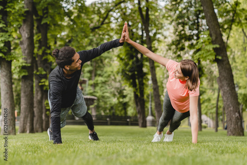 Fit healthy young male and female athletes boyfriend and girlfriend friends couple standing in plank position stretching warming-up before training workout together outdoors in city park.