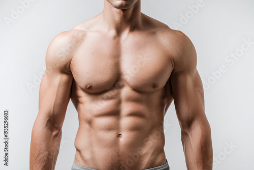 fit, male, torso, defined, abs, frontal, view, clean, white, studio, background, balanced, soft, lighting, highlighting, core