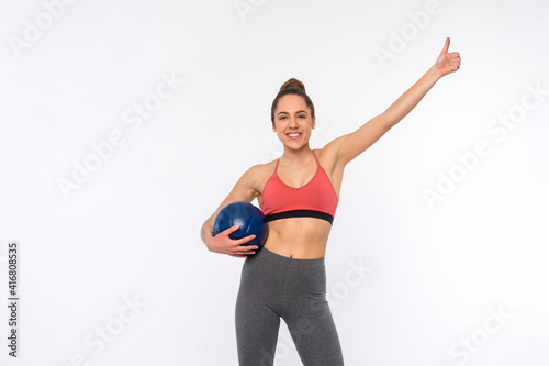 Fit young brunette girl exercise with blue medicine ball on white background