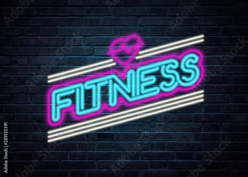 Fitness and sports neon sign on a brick wall