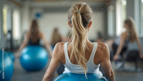 fitness, exercise, physical exercise, gym, woman, ball, group, class, training, health, wellness, healthy, lifestyle, sport, people, female, active, body, strength, core, stability, balance, instructor, trainer, studio, indoor, back, view, ponytail, tank top, muscle, strong, fit, blue, equipment, aerobic, pilates, yoga, cardio, motivation, determination, effort, perspiring, well-being, physical activity