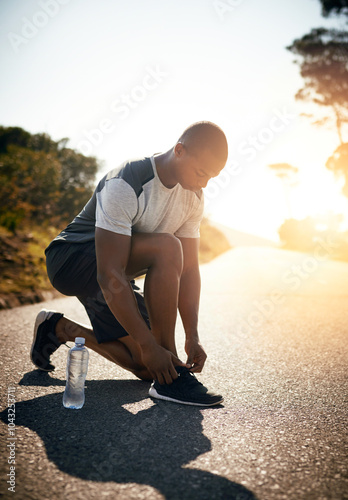 Fitness, man and tie sneakers outdoor for morning jog, cardio exercise or marathon training. Nature lens flare, person or fasten running shoes for workout, prepare for race or getting ready in street