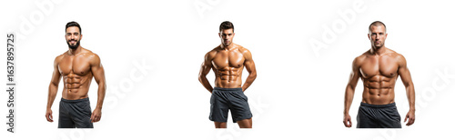 Fitness models posing studio bright lighting front male aesthetics and strength. Cut out PNG set