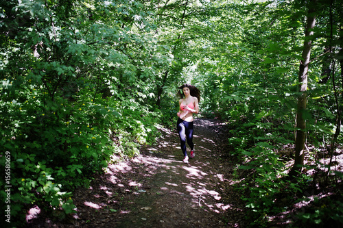 Fitness sport girl in sportswear running in forest, outdoor sports, urban style.