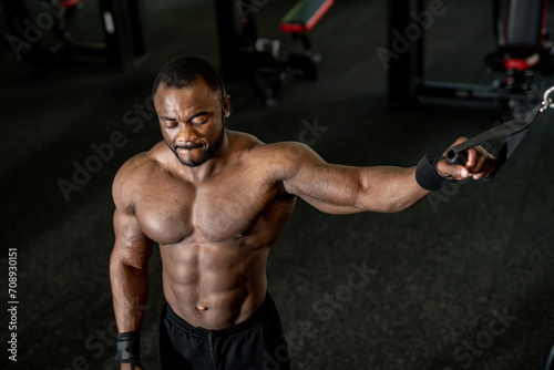 Fitness trained muscular guy working out in gym. Strong training concept photo.