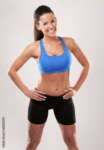 20s, 30s, adult, attractive, background, beautiful, beauty, cheerful, ethnic, ethnicity, exercising, female, fit, fitness, girl, happiness, happy, healthy, joy, joyful, muscle, person, portrait, pretty, smiling, sport, woman, working, physical exercise, young, caucasian, brunette, light, blue