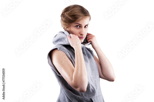 fitness woman in sport style standing against white background.