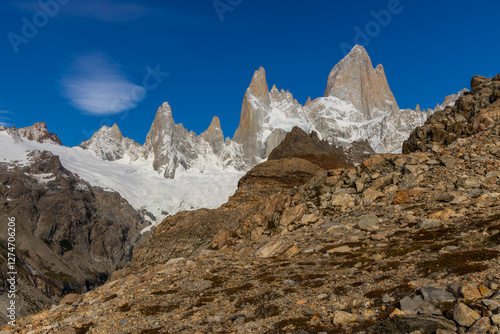 Fitz Roy sharp mountain peaks rise above a serene glacial lake, surrounded by rugged terrain snow-covered slopes in Patagonia, Argentina, El Chalten. Fitzroy mountain granite peak laguna de Los Tres