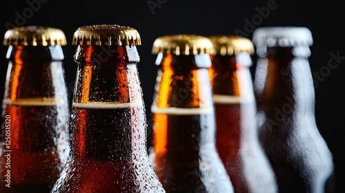 Five bottles of beer stand proudly against a striking black background, showcasing their amber tones and shimmering droplets of condensation. A visual celebration of refreshment