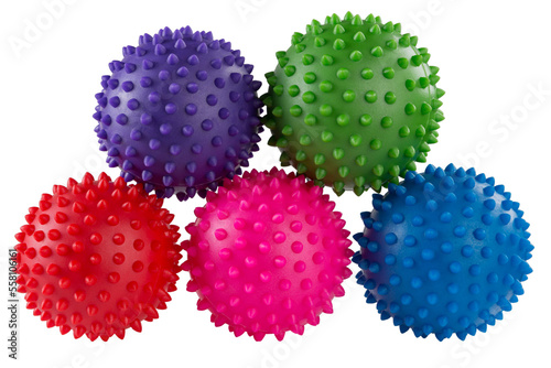 Five colored rubber massage balls with spikes, on a white background, isolate