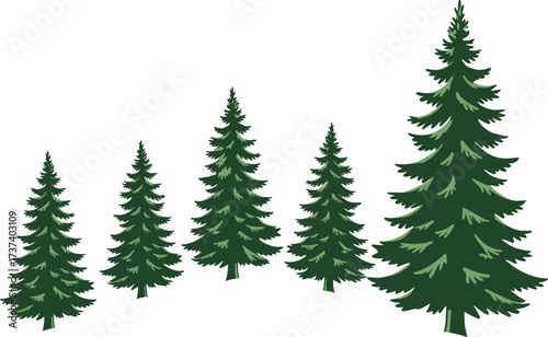 Five coniferous evergreen trees in size progression, stylized foliage highlights, symmetrical forest illustration on white background for nature design