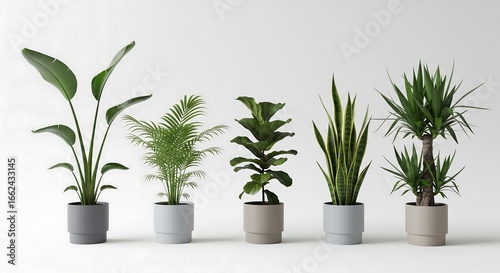 Five diverse potted houseplants – Bird of Paradise, parlor palm, fiddle leaf fig, snake plant, and yucca – arranged in a row against a white background. Modern, minimalist aesthetic.