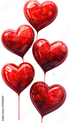 Five glossy red hearts on sticks