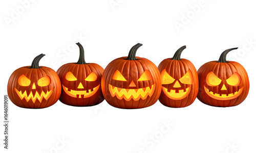 Five glowing jack o lanterns with scary faces isolated on transparent background
