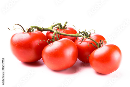 Five juicy red shiny tomatoes on a green stem laying on a white background