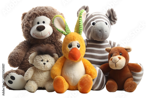 Five plush stuffed animal toys on white background isolated on a transparent background .PNG