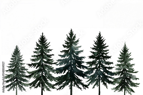 Five silhouette evergreen trees in watercolor art