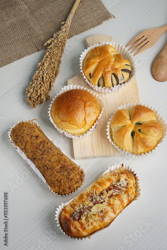 five toasted bread topped with shredded beef, cheese sausage, chocolate, pandan, on a white table photographed with studio lighting and wooden theme props