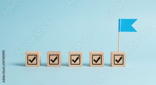 Five wooden blocks with check marks and a blue flag on a light blue background