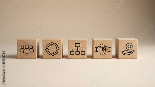 Five wooden cubes display essential business icons including teamwork process organization collaboration and service on a bright clear background