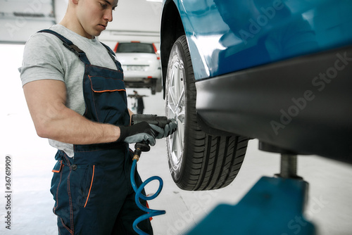 Fix the wheels. Professional male mechanic screwing or unscrewing car wheel of lifted automobile by pneumatic wrench at auto repair shop