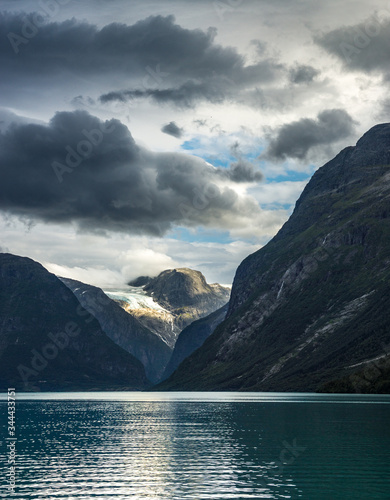fjord and river in norway during summer with mountains and cloudy blue sky