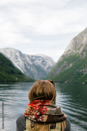 admiring, backview, long hair, woman, water, view, unrecognizable, travel, holiday maker, tour tourism, tour, secluded, scenic, foulard, scandinavian, scandinavia, outdoors, norwegian, norge, mountain chain, mountain, landscape, journey, head, ferry, female, european, europa, cold, cliff, boat, back, caucasian, white