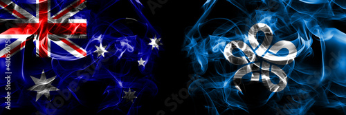 Flags of Australia, Australian vs Japan, Japanese, Fukuoka Prefecture. Smoke flag placed side by side on black background