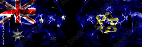 Flags of Australia, Australian vs Japan, Japanese, Makkari, Hokkaido, Shiribeshi, Subprefecture. Smoke flag placed side by side on black background