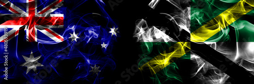 Flags of Australia, Australian vs United States of America, America, US, USA, American, Monterey, California. Smoke flag placed side by side on black background