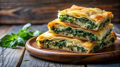 Flaky layers of filo pastry surrounding a rich spinach filling in a traditional homemade dish, homemade puff pie, spinach pastry