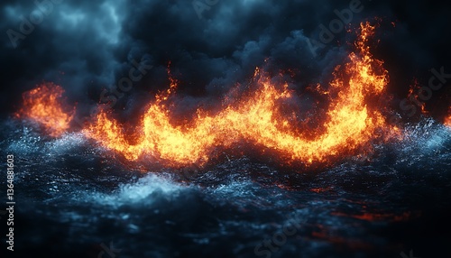 fire, water, wave, ocean, sea, flames, burning, dark, sky, cloud, stormy, orange, red, blue, surface, abstract, heat, energy, power, night, chaos, dramatic, intense, glowing, illuminated, motion, texture, effect, fantasy, imagination, concept, artwork, digital, illustration, atmosphere, epic, dynamic, turbulent, depth, contrast, visual, wallpaper, background, element, graphic, surreal, artistic