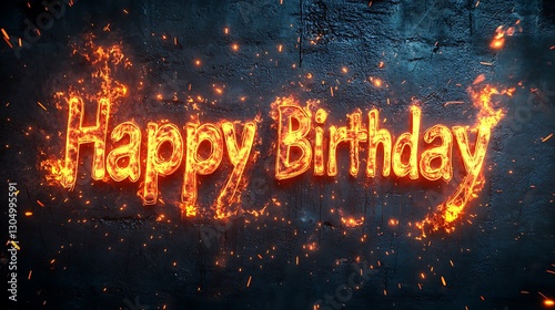 Flaming "Happy Birthday" graffiti with glowing fire accents outlining the letters, vibrant sparks and embers scattered around, set on a dark concrete wall, dramatic and intense atmosphere, ultra HD.