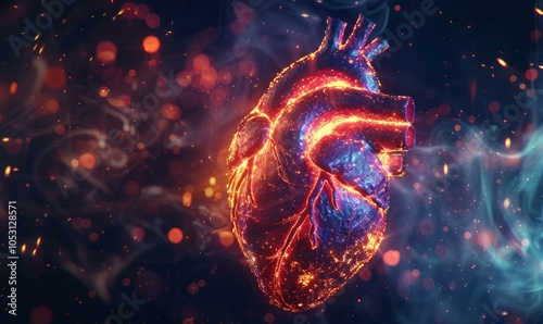 flaming heart in space with stars and bokeh background. Heart on fire on textured background