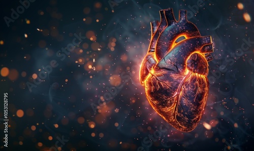 flaming heart in space with stars and bokeh background. Heart on fire on textured background