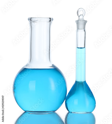 Flasks with blue liquid isolated on white. Laboratory glassware