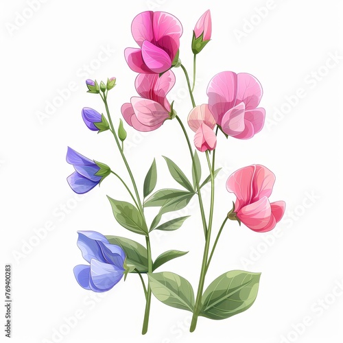 Flat Design, Beautiful Sweet Pea Lathyrus Flower Illustration, Vector Style.