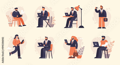 flat, design, figure, working, laptop, device, light, background, business, people, man, woman, professional, office, remote, work, computer, technology, tablet, phone, meeting, collaboration, communication, modern, corporate, creative, project, online, digital, entrepreneur, startup, casual attire, formal, presentation, strategy, success, career, individual, group, team, productivity, management, development, innovation, research, analysis, planning